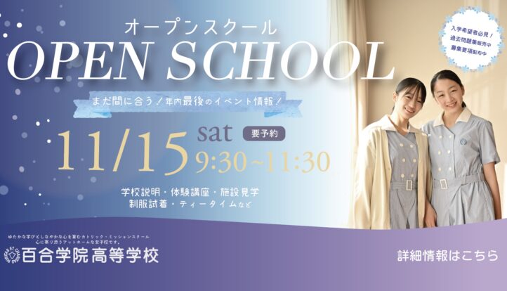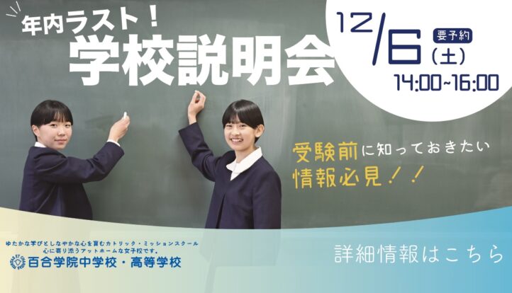 認定こども園百合学院幼稚園 百合学院小学校 百合学院中学校 百合学院高等学校 百合学院について 百合学院の教育 教職員採用情報 2025年11月10日(月) 11月10日(月)の百合学院小学校 2025年11月07日(金) 11月7日(金)の百合学院小学校 2025年11月05日(水) 11月5日(水)の百合学院小学校 2025年10月30日(木) 10月25日(土)ユリンピック 2025年10月22日(水) 10月22日(水)レシテーションコンテスト 2025年10月17日(金) 10月17日(金)ユリンピック練習